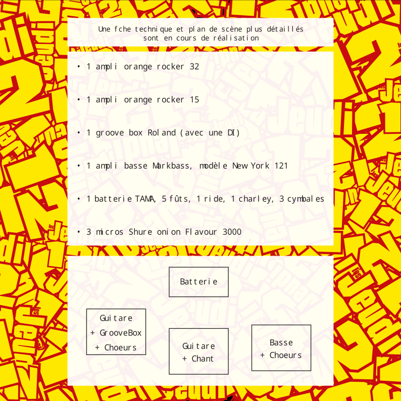 Nos concerts peuvent durer environ 1h30, avec une 20aine de titres, essentiellement des compositions du groupe, et 2 covers très adaptés.